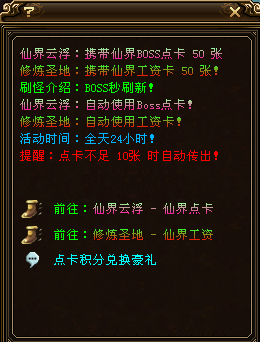 挂机分四种模式可选 1、固定地图,2、自动循环地图,3、固定地图自动换位置使用点卡,4、固定地图原地使用点卡,回城自动结束挂机!!
